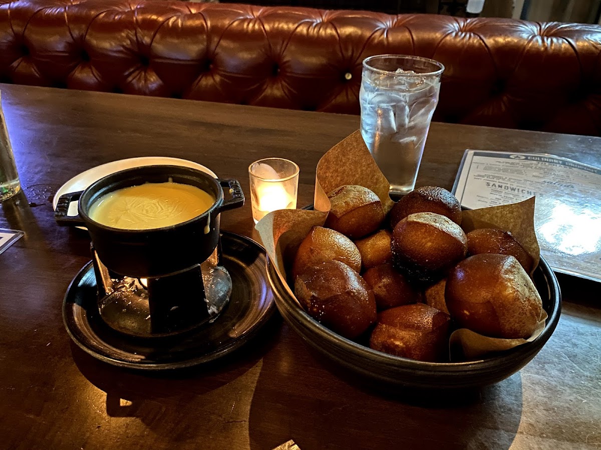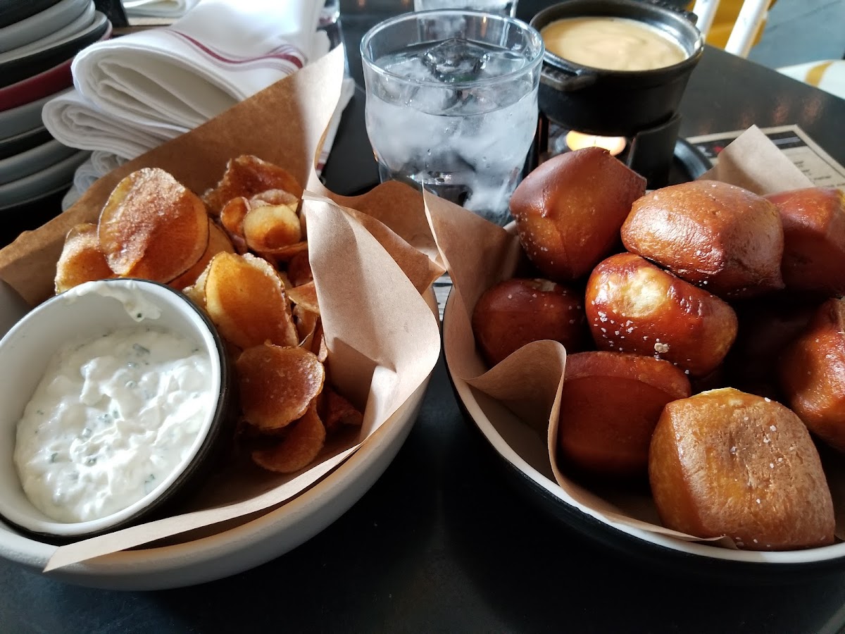 The menu brings a comforting blend of American and elevated pub fare that’s easy to share or savor solo. Crowd-pleasers like soft pretzels with provolone fondue and house potato chips are as satisfying as the heartier mains—fried chicken with honey-drizzled buttermilk biscuits or roasted salmon paired with seasonal vegetables. Lighter options, including kale and cobb salads, offer a fresh balance, while desserts such as banana cream pie or cinnamon apple monkey bread provide a sweet finish without fuss.