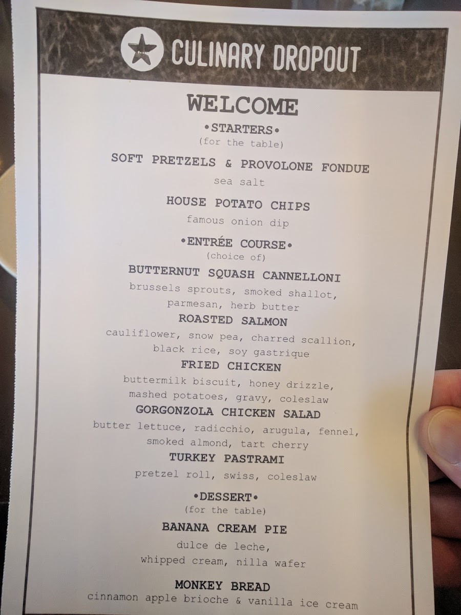 Entrée Course: The entrée offerings feature a range of dishes including butternut squash cannelloni with Brussels sprouts and parmesan, roasted salmon accompanied by cauliflower and black rice, fried chicken paired with mashed potatoes and coleslaw, gorgonzola chicken salad with mixed greens and smoked almonds, and a turkey pastrami sandwich on a pretzel roll with swiss cheese and coleslaw. These dishes provide a mix of protein-focused meals and vegetarian-friendly options.